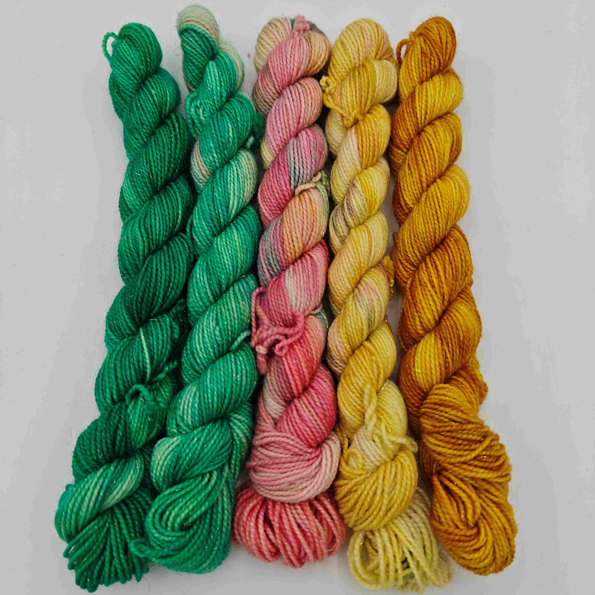 Minisetti, joka koostuu viidestä 20g pikkuvyyhdistä! Eikä mistä tahansa pikkuvyyhdistä, vaan KIMALTEISESTA pikkuvyyhdistä. Lankaan on siis kehrätty mukaan stellinaa, joka tuo lankaan säihkettä.