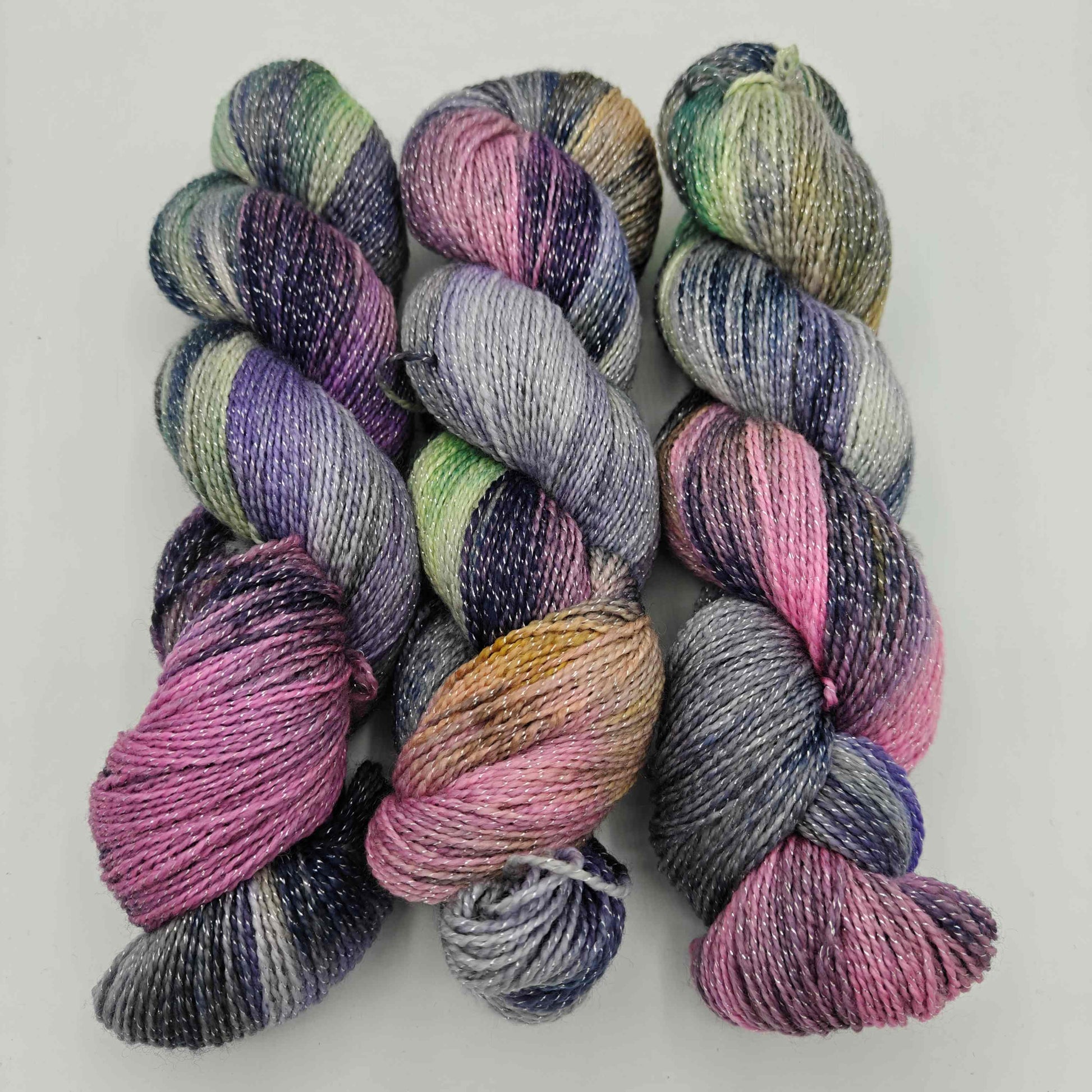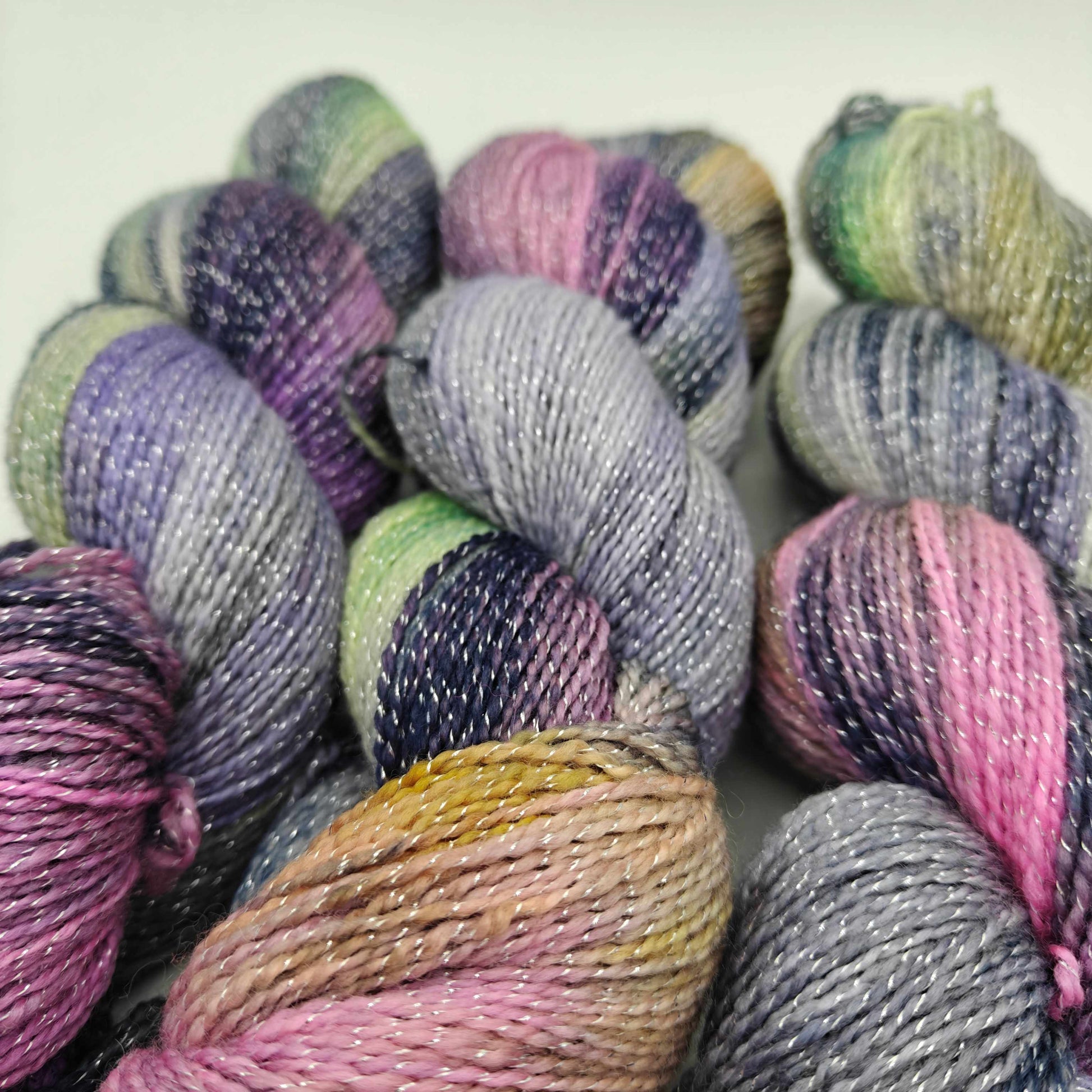 Käsinvärjätty merinovillalanka, johon on kehrätty mukaan säihkyvä lurex-säie. Sopii hyvin esimerkiksi huiveihin!