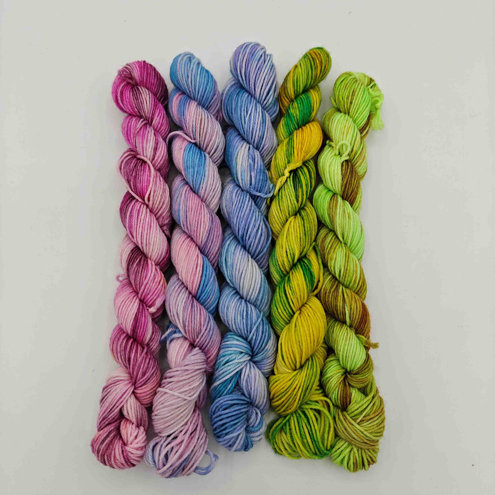 Minisetti koostuu viidestä käsinvärjätystä 20g pikkuvyyhdistä, eli yhteensä 100g lankaa.