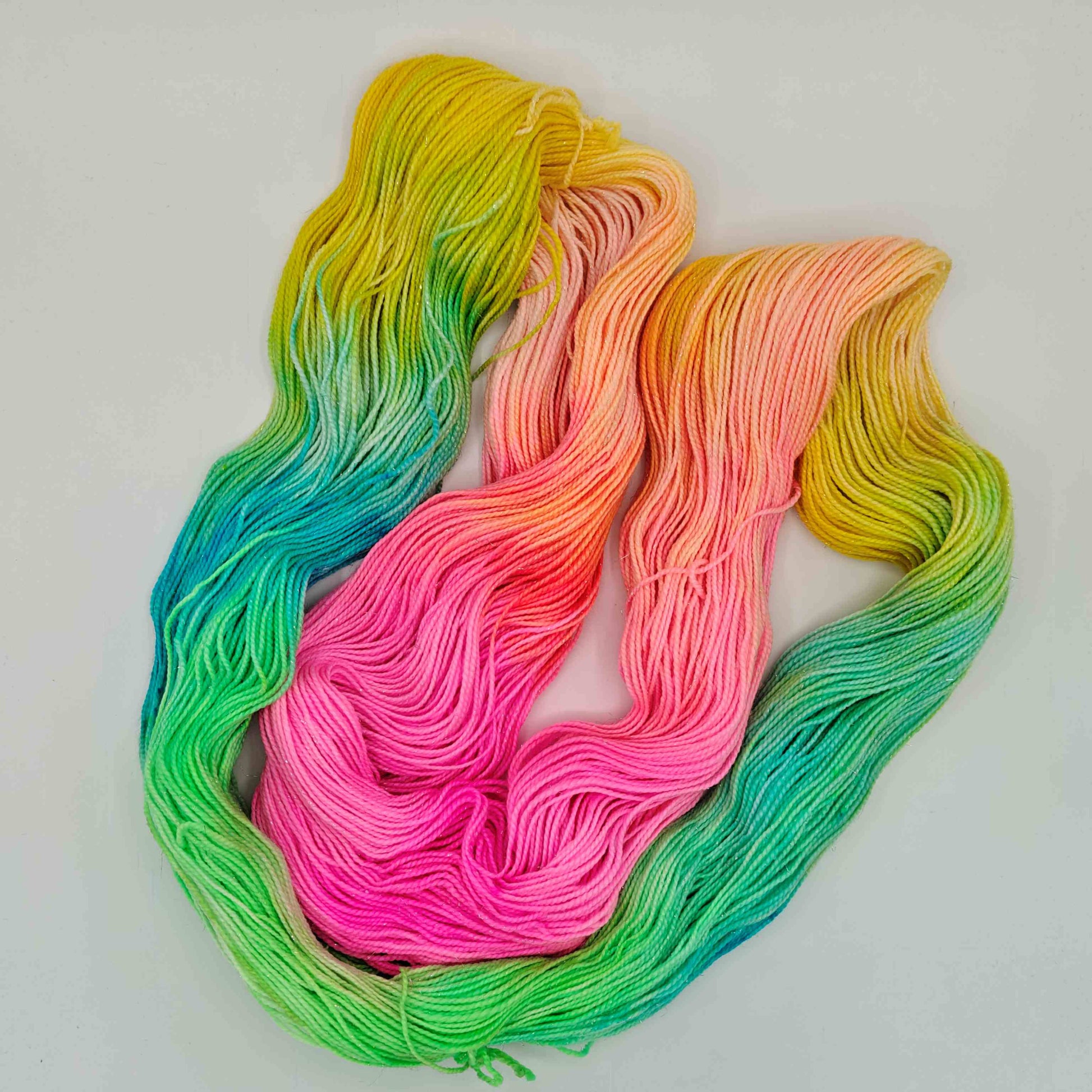 Herkkupala, käsinvärjätty nailonilla vahvistettu merinosukkalanka, johon on kehrätty mukaan stellinaa tuomaan kimalletta. Kirkasta kirkasta! Keltaista, pinkkiä, turkoosia ja vihreää, sekä sävyjä niiden väliltä.