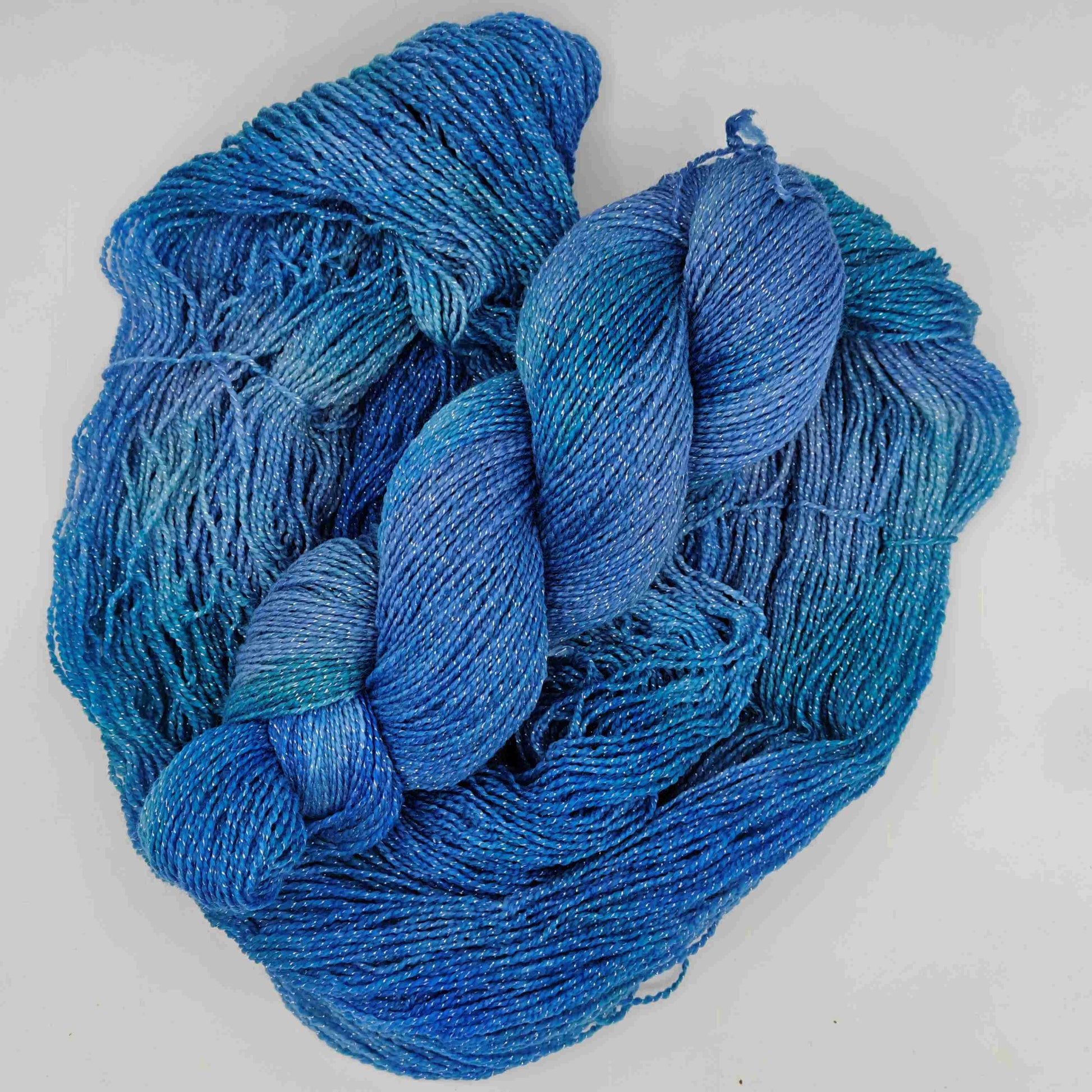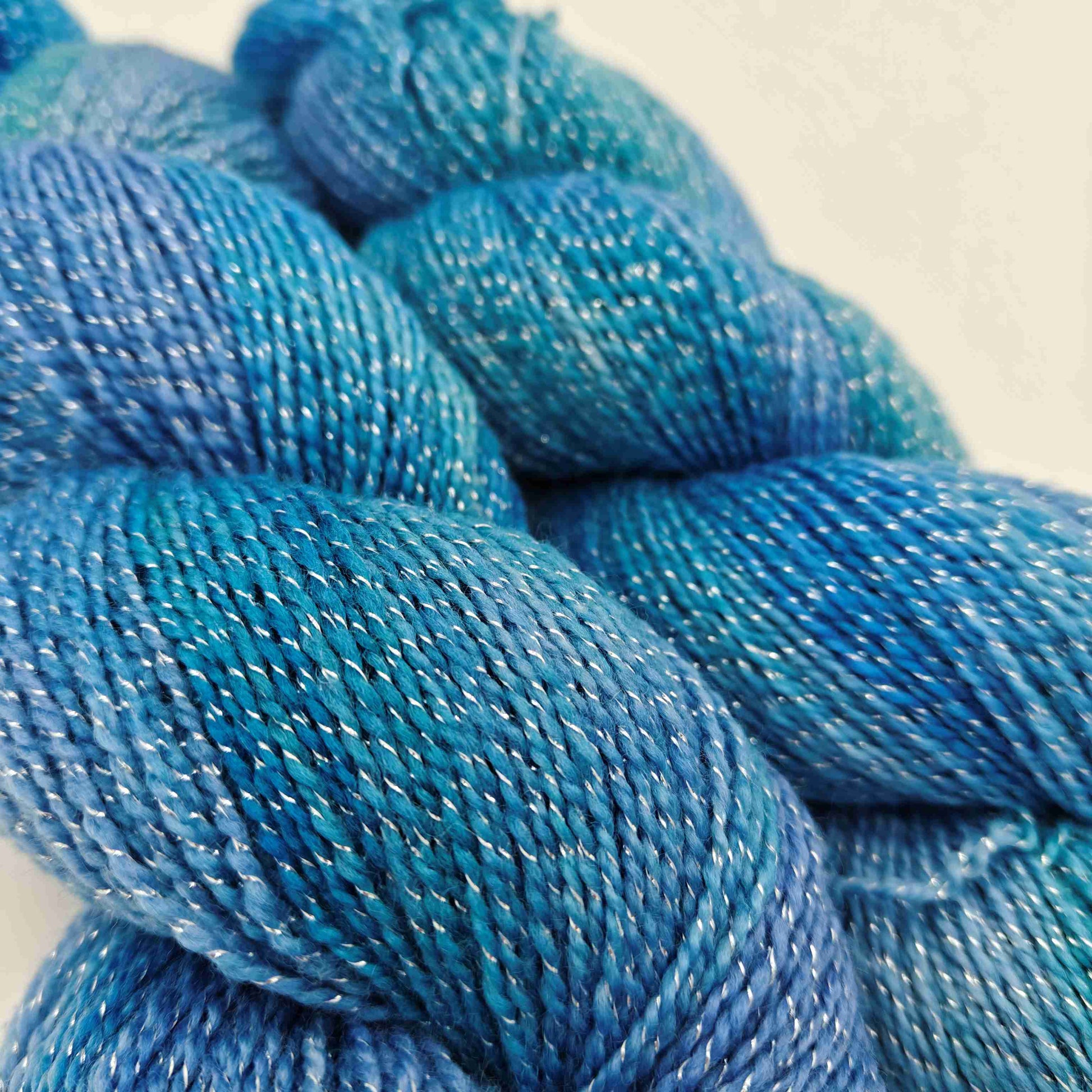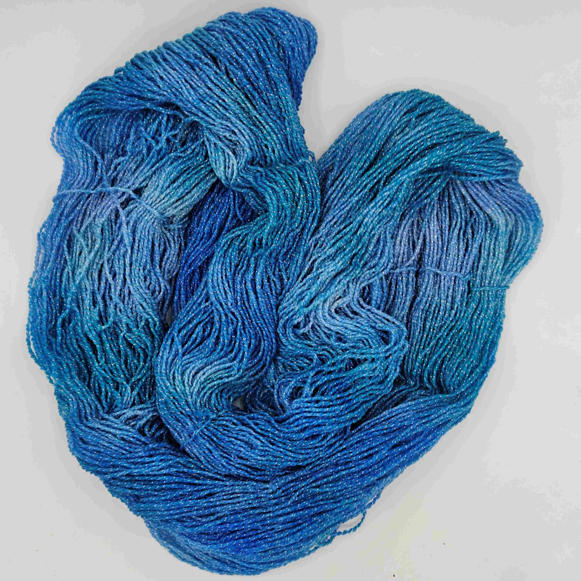 Käsinvärjätty merinovillalanka, johon on kehrätty mukaan säihkyvä lurex-säie. Sopii hyvin esimerkiksi huiveihin!