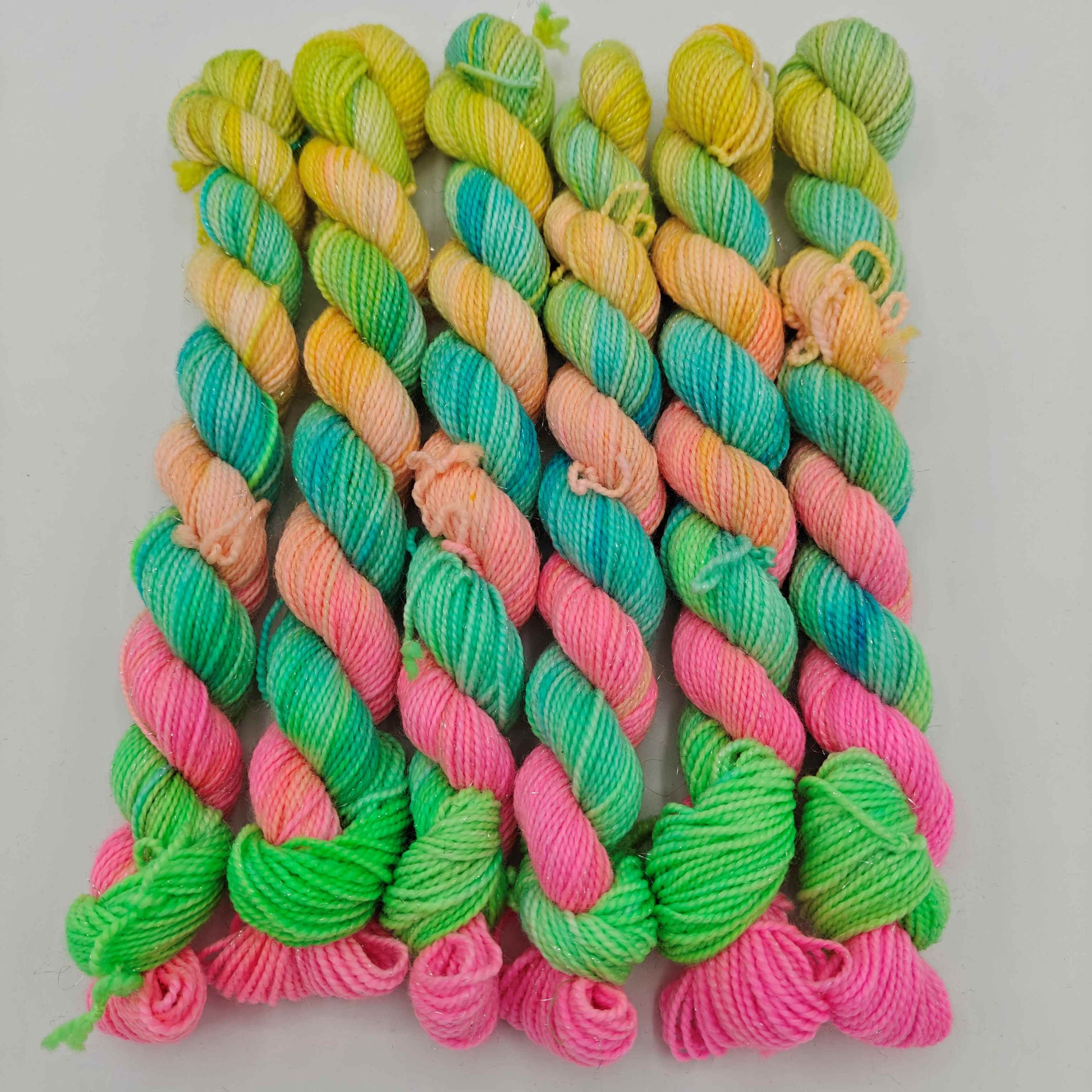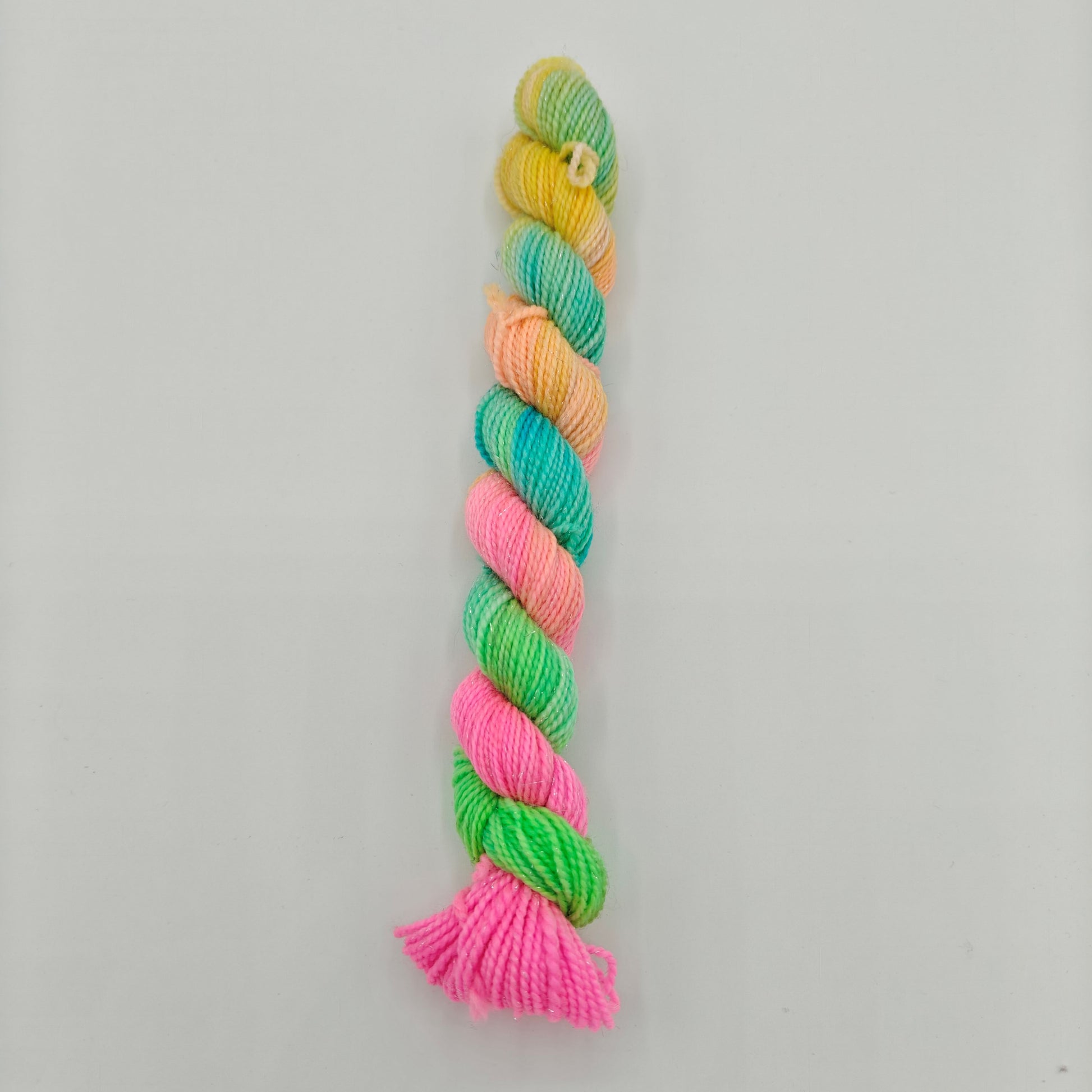 Pikkutaika, eli 20g pikkuvyyhti käsinvärjättyä kimallesukkalankaa! Lankaan on siis kehrätty mukaan stellinaa, joka tuo siihen säihkettä.
