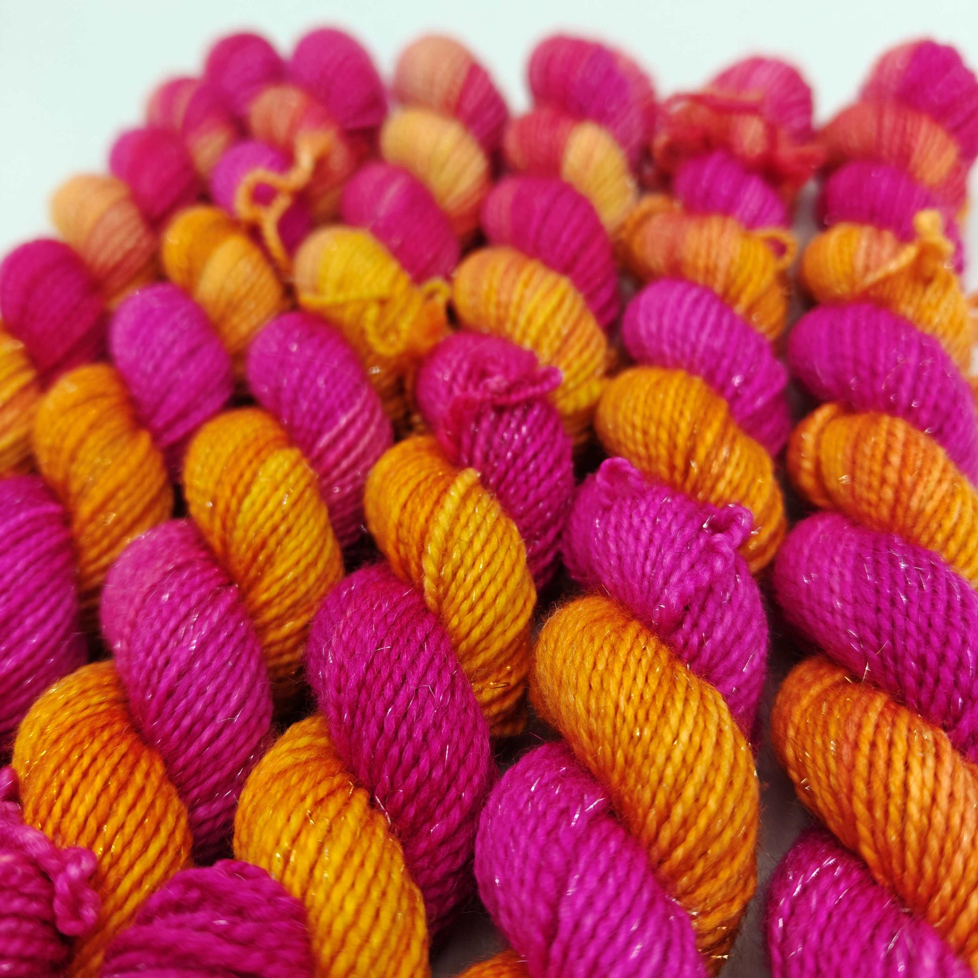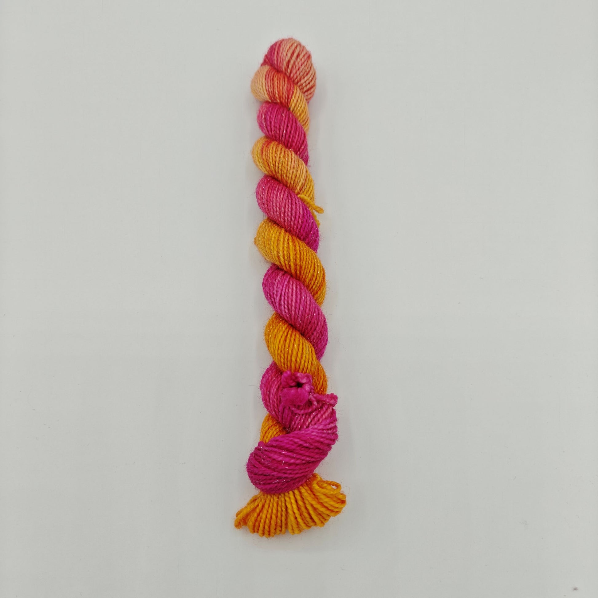 Pikkutaika, eli 20g pikkuvyyhti käsinvärjättyä kimallesukkalankaa! Lankaan on siis kehrätty mukaan stellinaa, joka tuo siihen säihkettä.