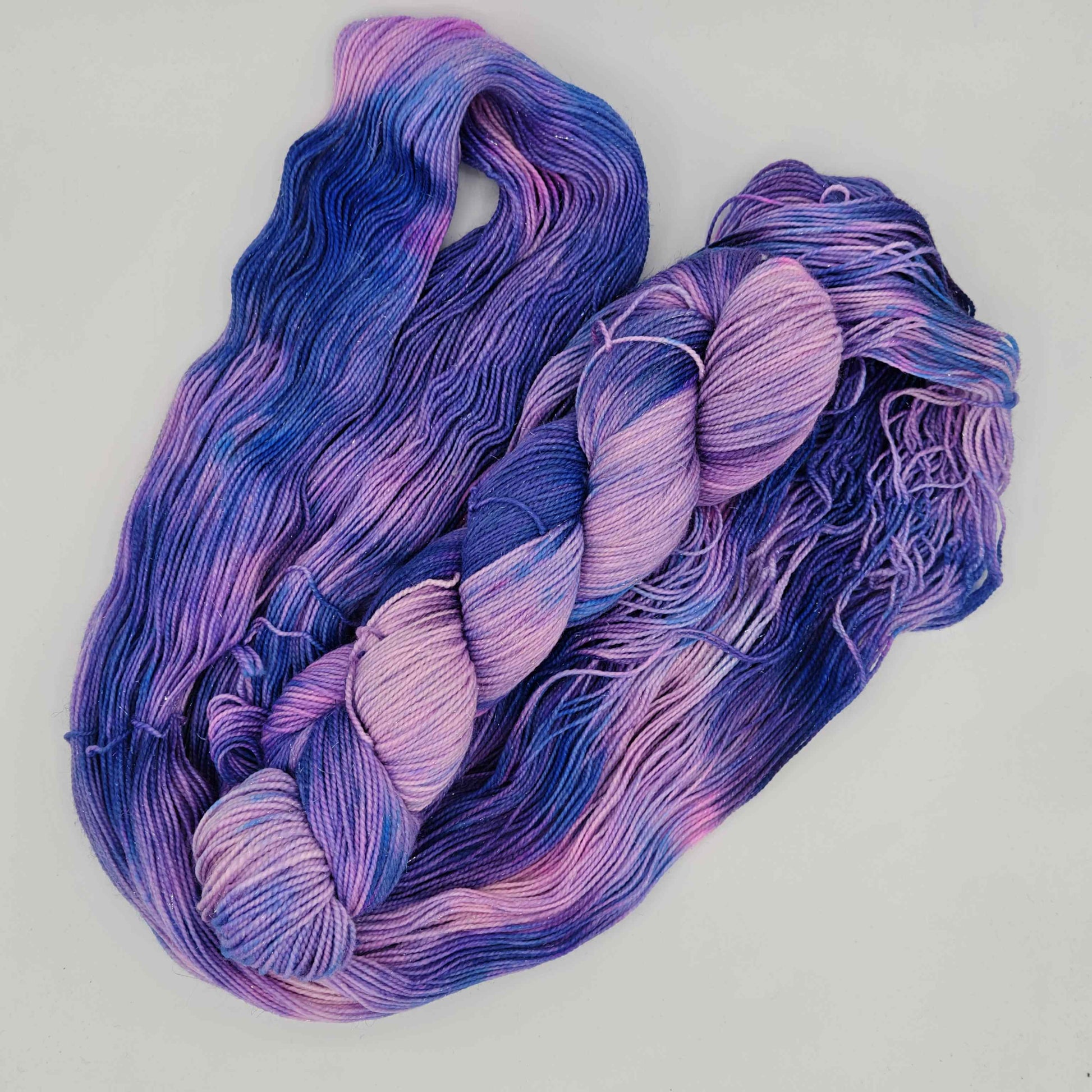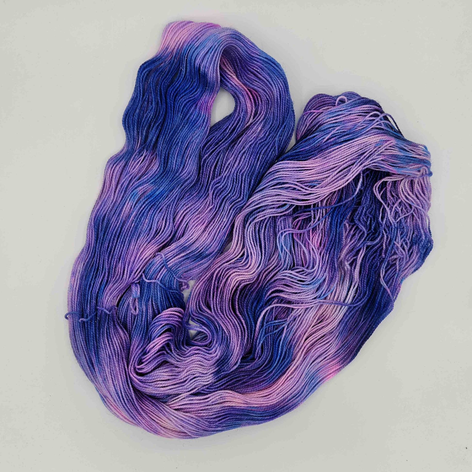 Galaksin karkki, käsinvärjätty nailonilla vahvistettu merinosukkalanka, johon on kehrätty mukaan stellinaa tuomaan kimalletta.. Sinisiä, violetteja ja vaaleanpunaisia sävyjä.
