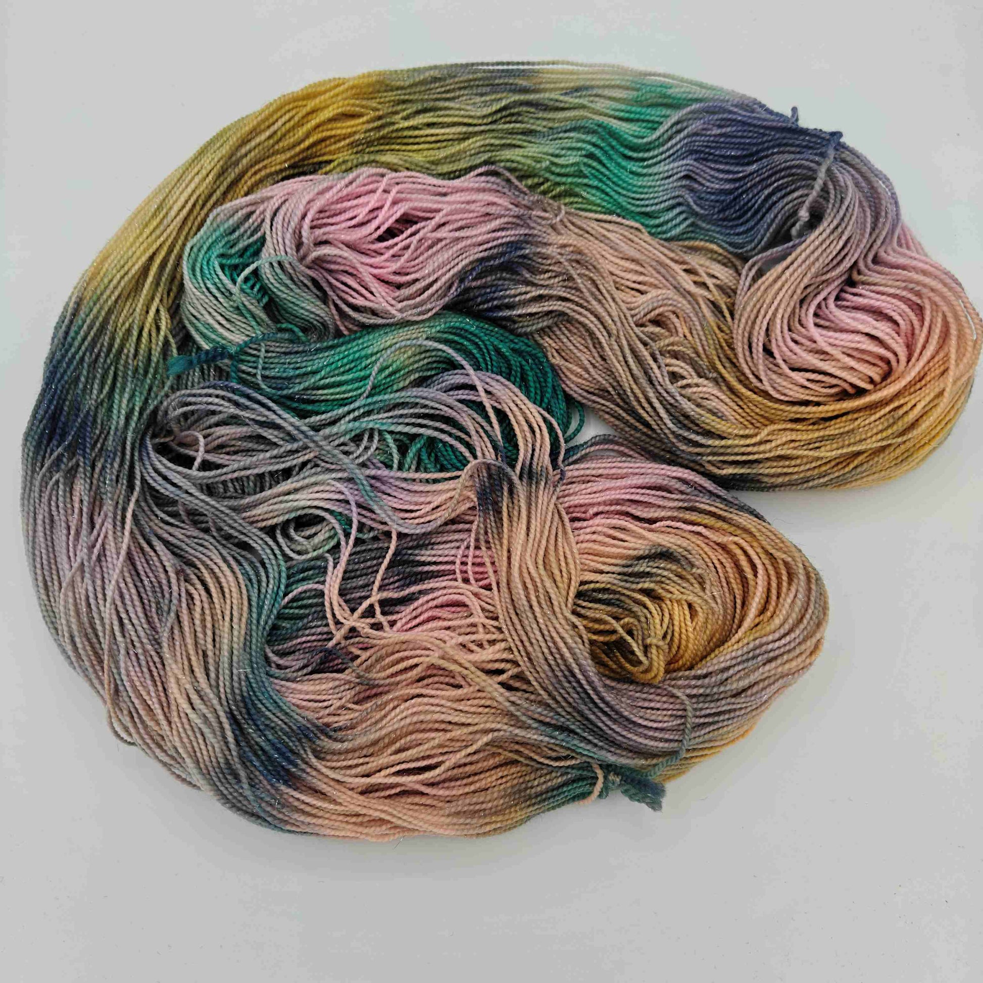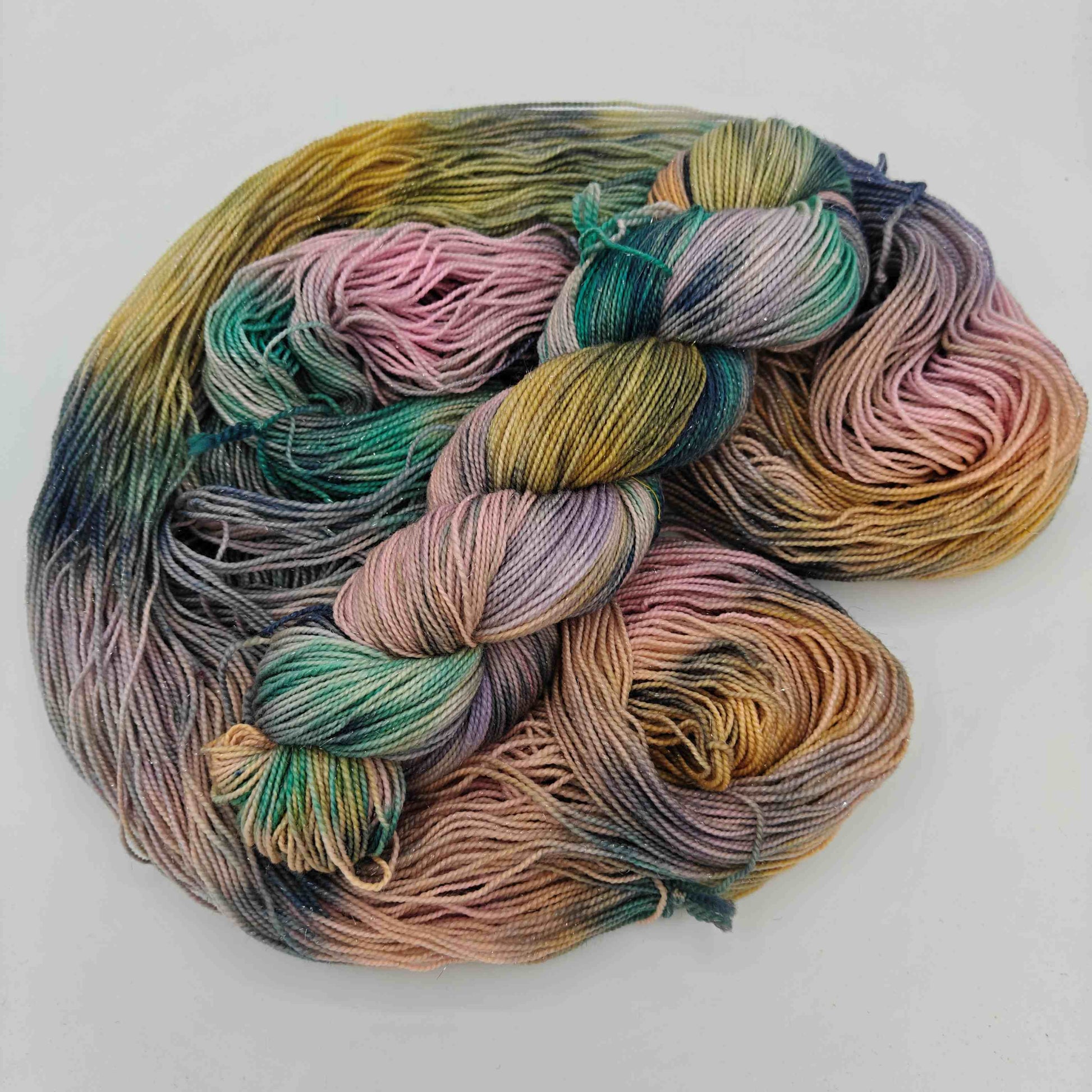 Taikahavainto, käsinvärjätty nailonilla vahvistettu merinosukkalanka, johon on kehrätty mukaan stellinaa tuomaan kimalletta.