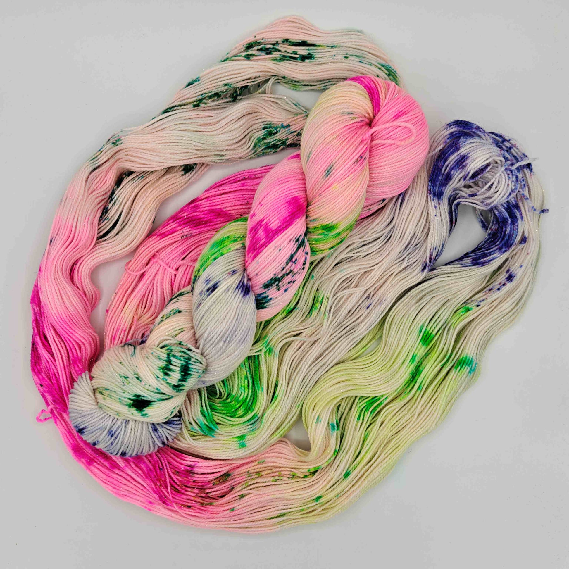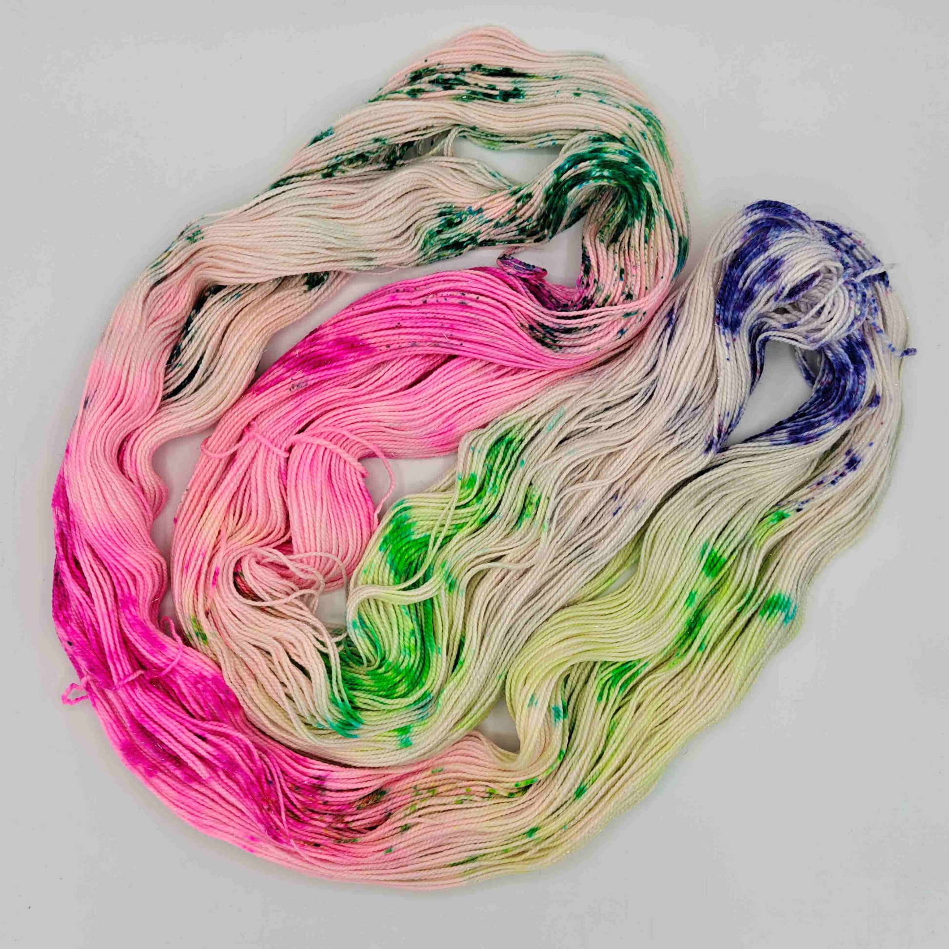 Tekevälle sattuu, käsinvärjätty nailonilla vahvistettu merinosukkalanka, johon on kehrätty mukaan stellinaa tuomaan kimalletta. Pilkkuja, tummaa ja kirkasta vihreää, sekä violettia ja pinkkiä vaalealla pohjalla!