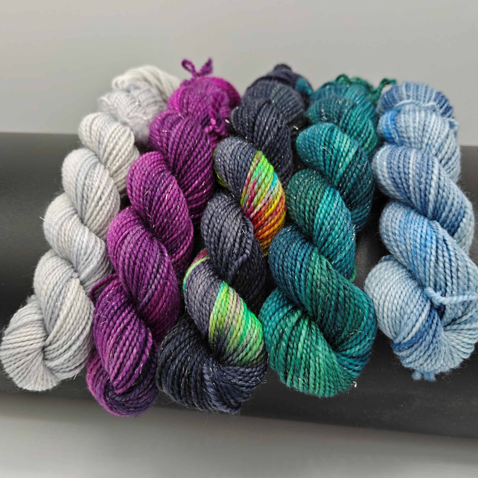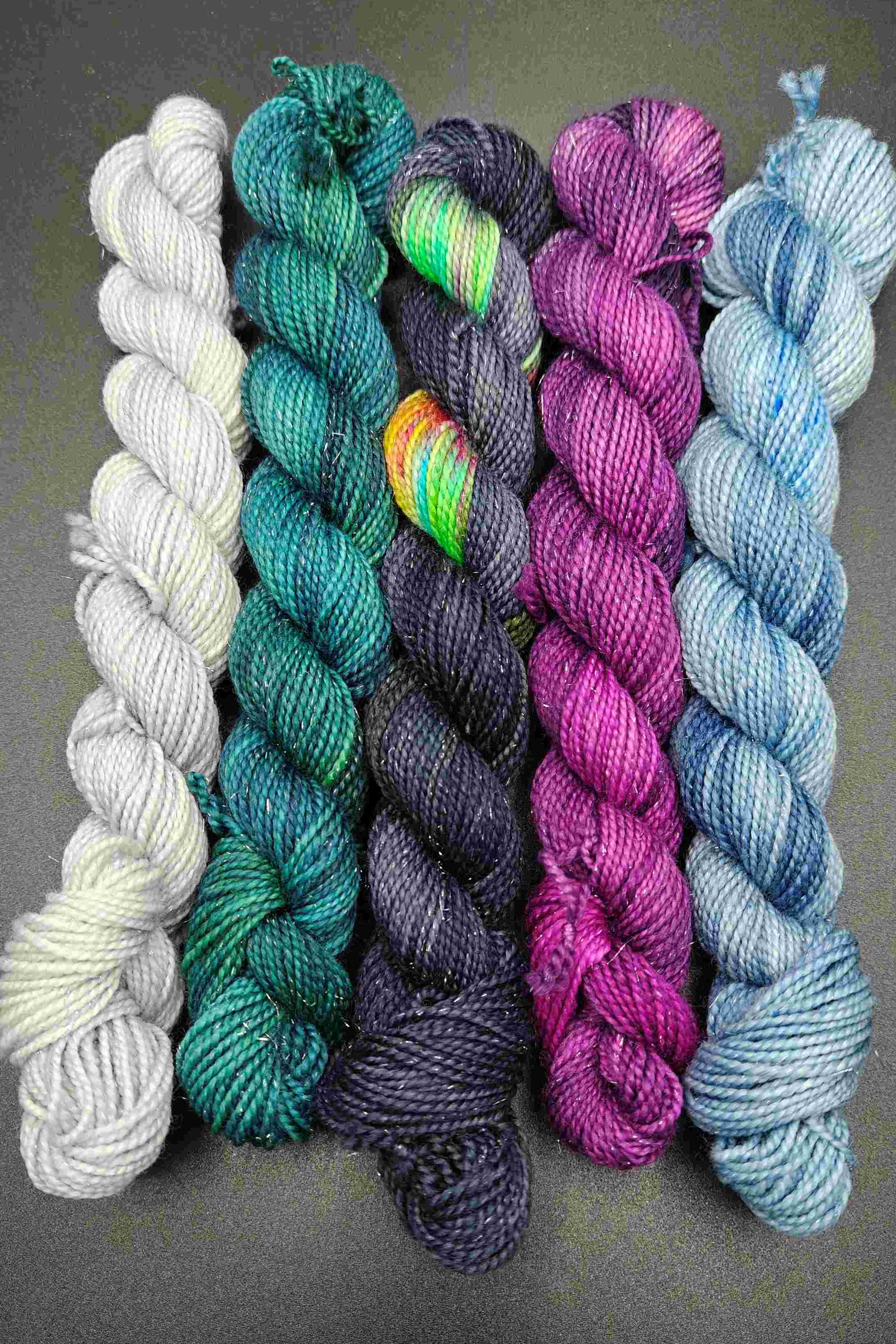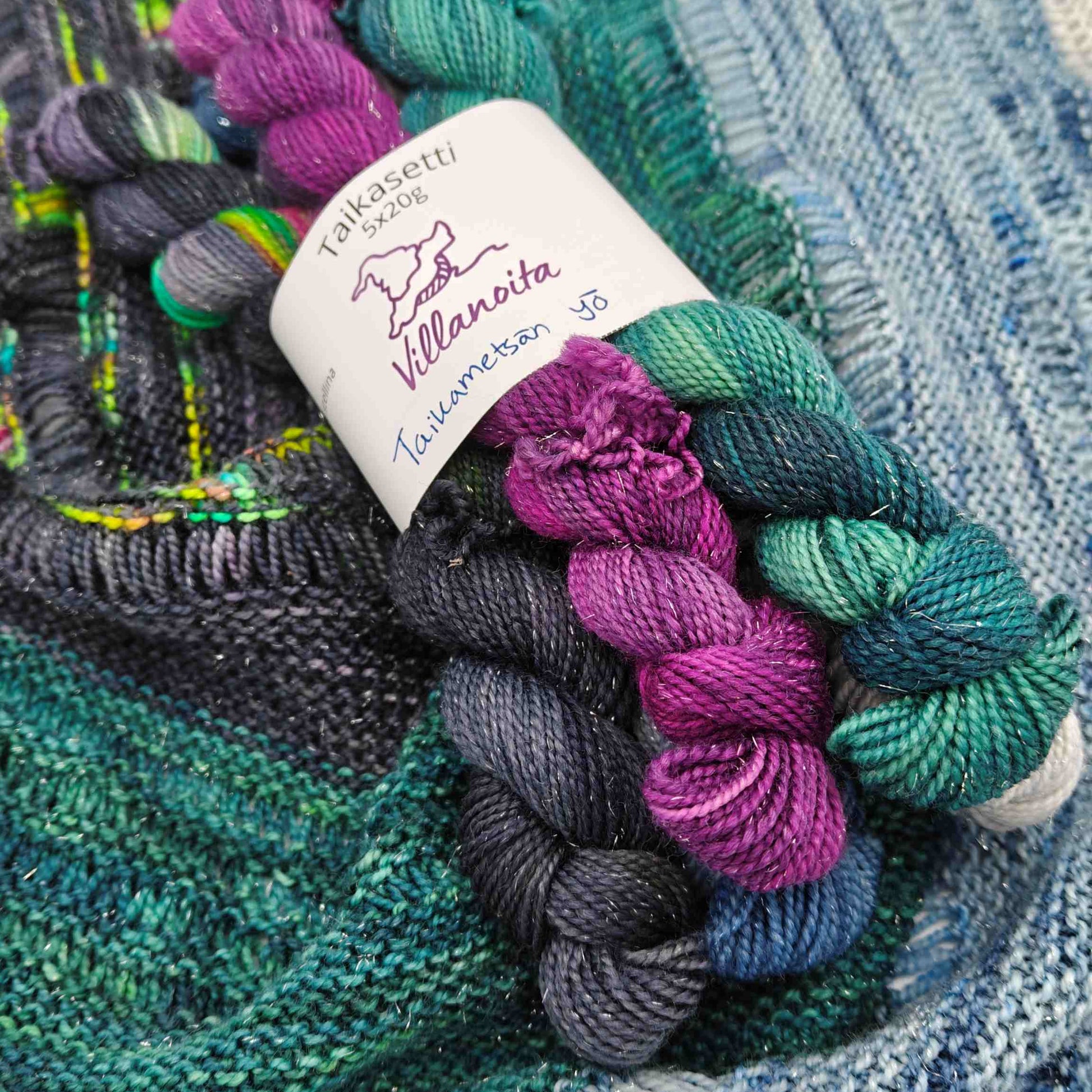 Minisetti, joka koostuu viidestä 20g pikkuvyyhdistä! Eikä mistä tahansa pikkuvyyhdistä, vaan KIMALTEISESTA pikkuvyyhdistä. Sisältää kaikki Taikametsän yö -kokoelman värit.