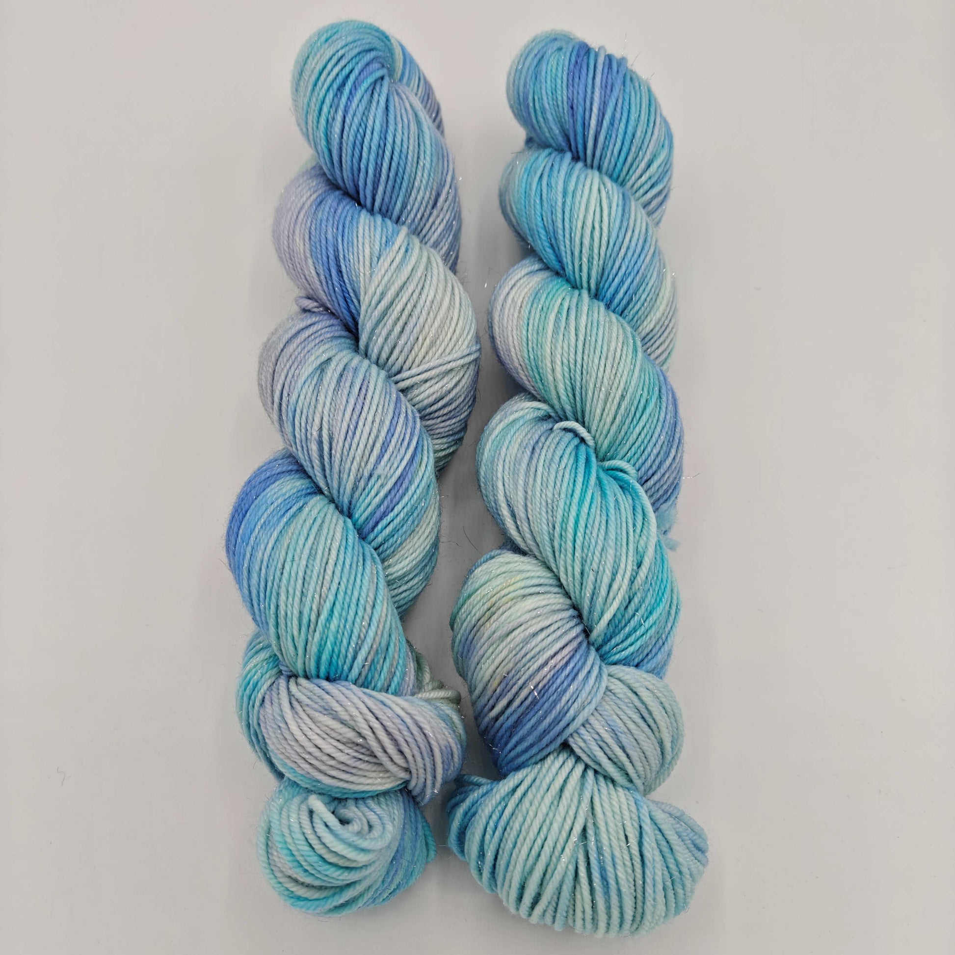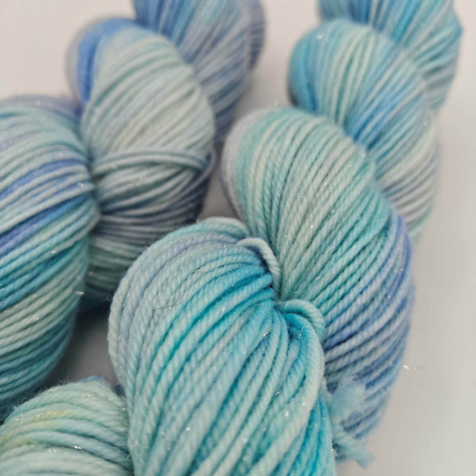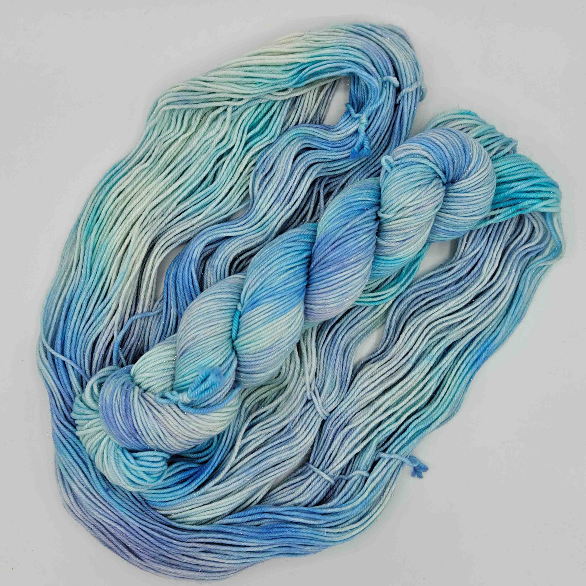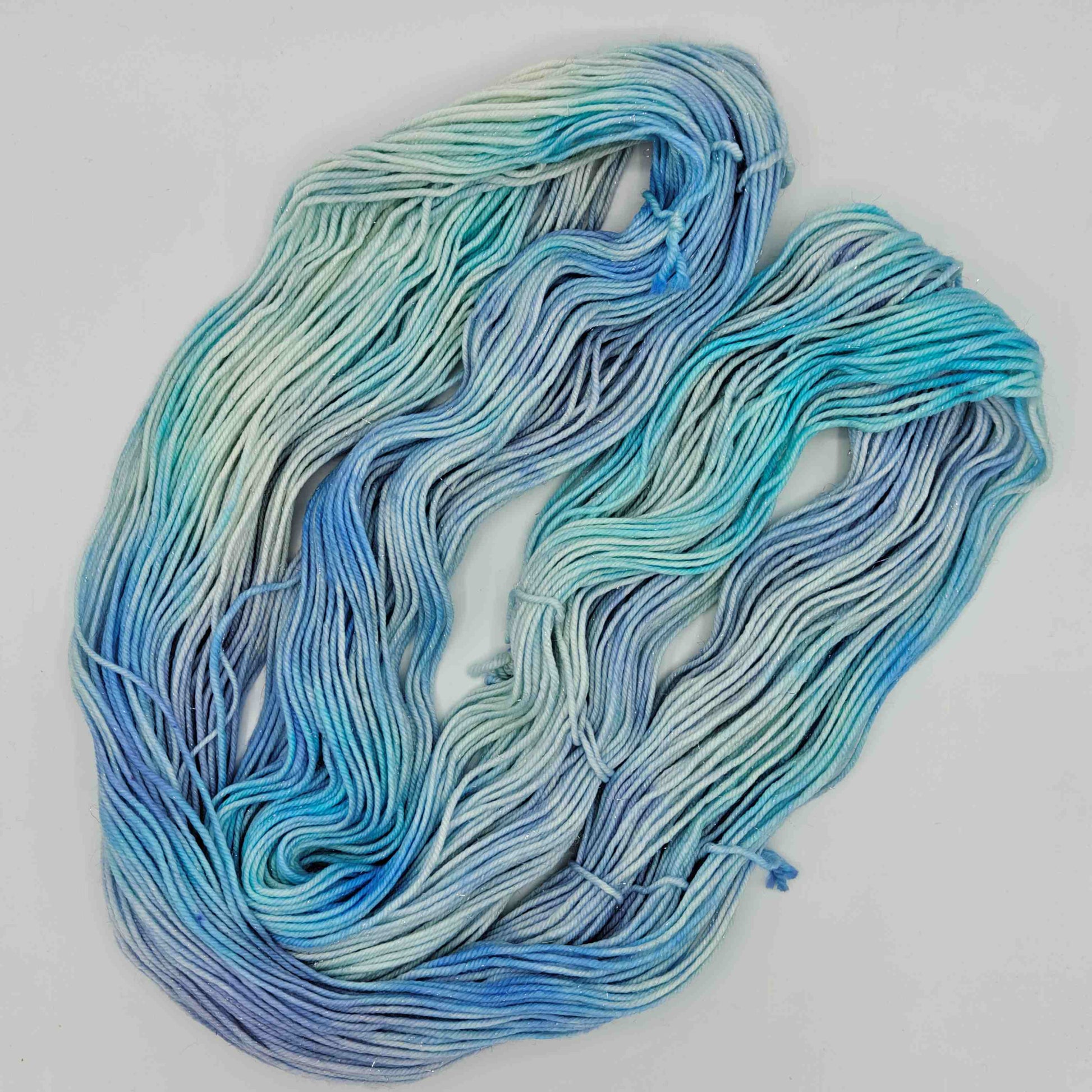 Jääkarhuntassu, paksumpi nailonilla vahvistettu käsinvärjätty merinosukkalanka, johon on kehrätty mukaan stellinaa tuomaan kimalletta.