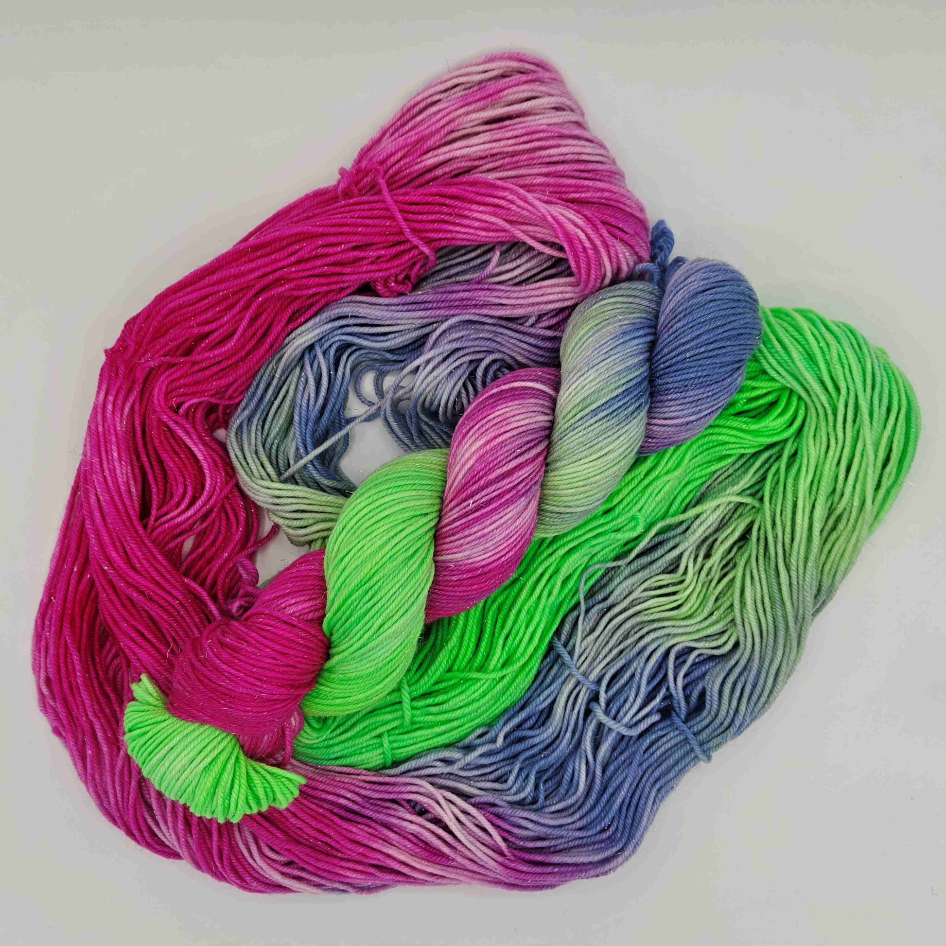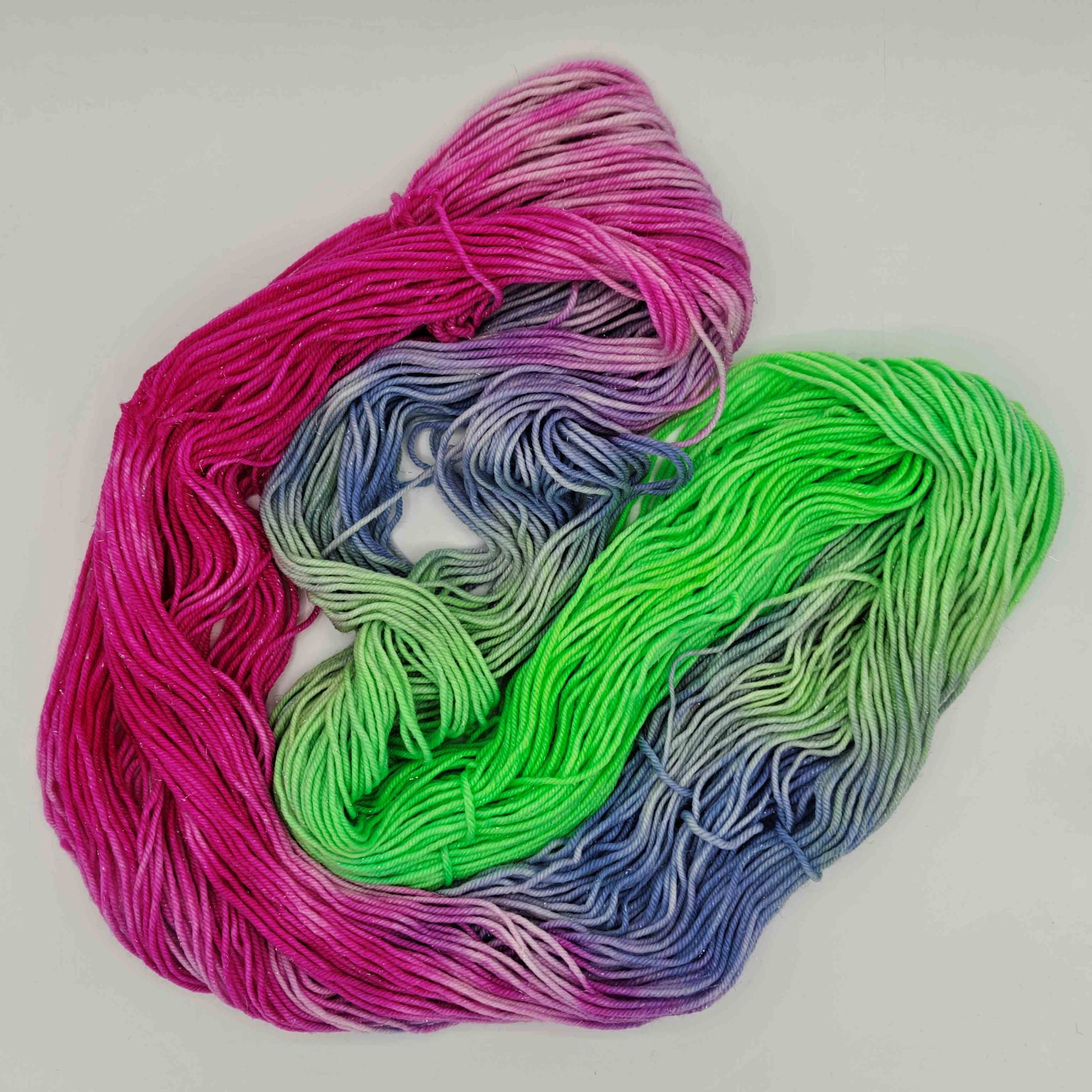 Taikajuoma, paksumpi nailonilla vahvistettu käsinvärjätty merinosukkalanka, johon on kehrätty mukaan stellinaa tuomaan kimalletta.